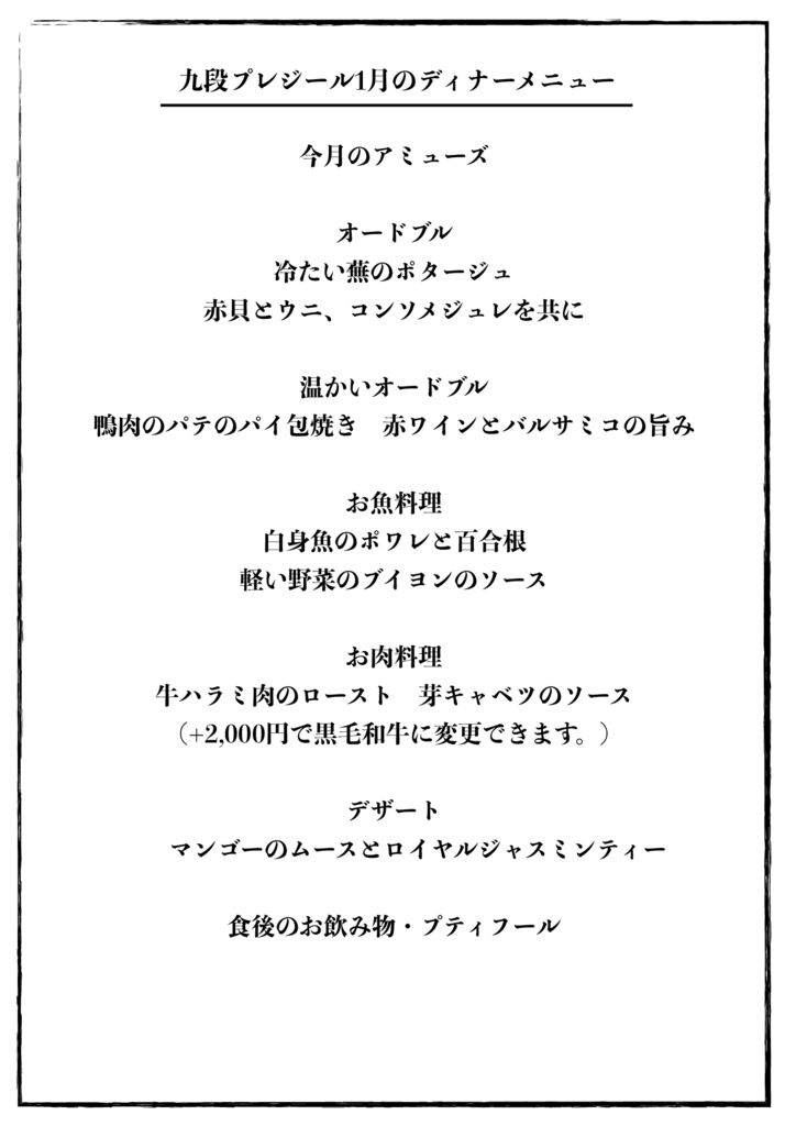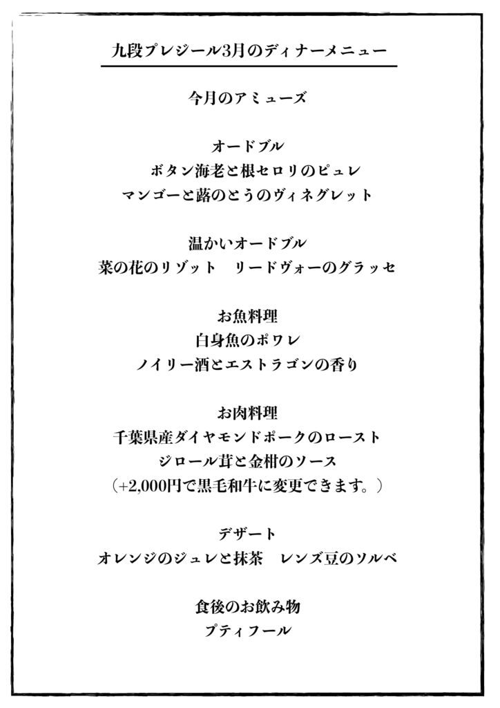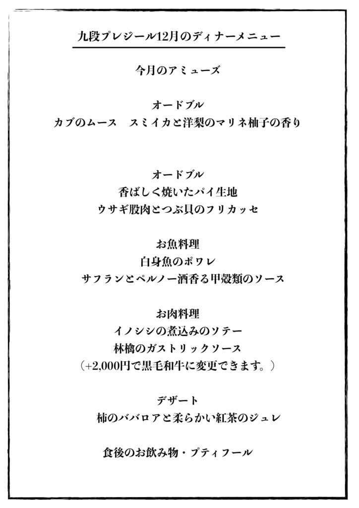 九段プレジールでは旬の食材をふんだんに使用し、フレンチをベースにした『和』のテイストを取り入れた月替りのディナーメニューをご提供いたします。